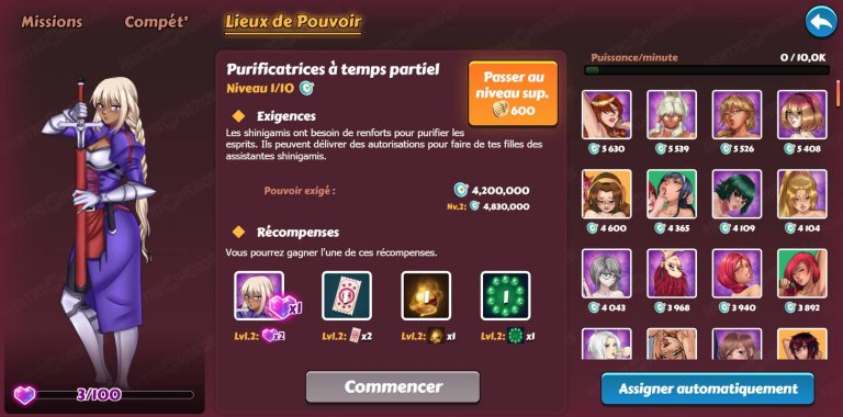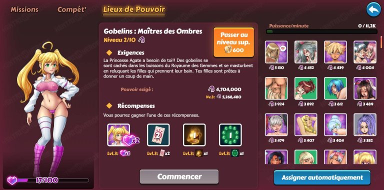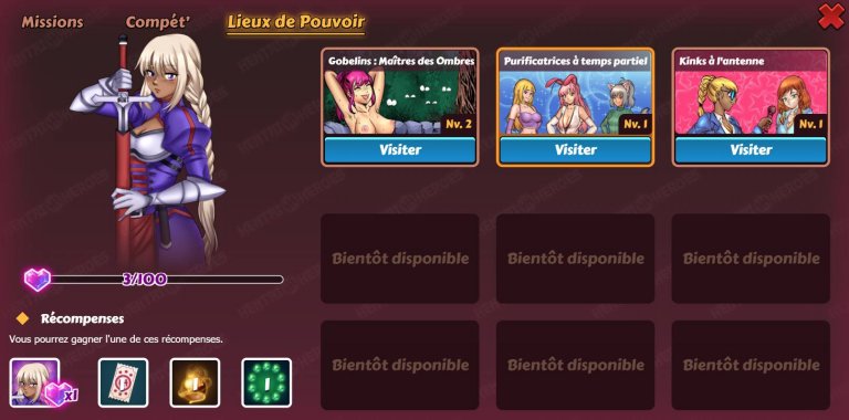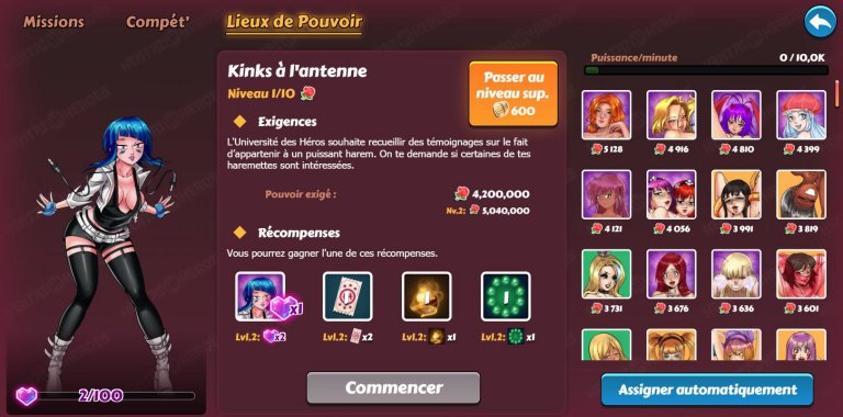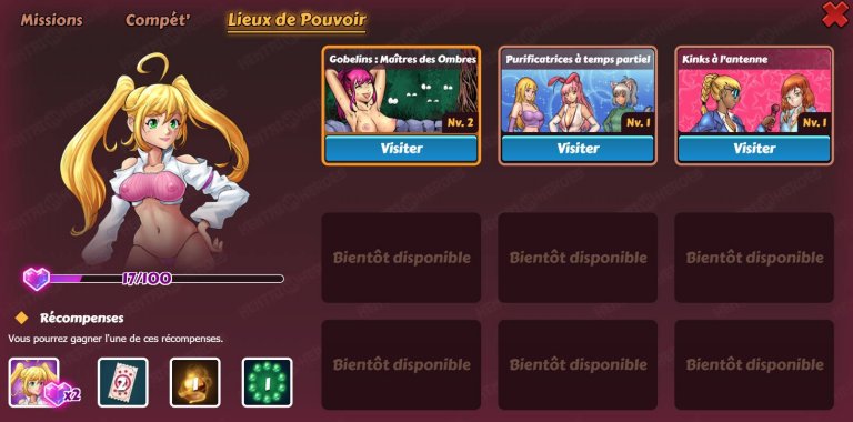 An den Orten der Macht können Sie Mädchen gewinnen, die in Hentai Heroes noch nie zuvor gesehen wurden. Sie sind nur in diesem Spielmodus zugänglich, aber du musst dich in Geduld üben, um sie freizuschalten. Jeder Ort wird durch das Voranschreiten im Story-Modus freigeschaltet und bietet Ihnen Zugang zu Belohnungen, die Ihnen helfen, leichter voranzukommen. Jeder Ort hat 10 Entwicklungsstufen, die nur mit Kobanern freigeschaltet werden können: 600 pro Stufe, und mit jeder Stufe steigen die Belohnungen. Um die Quest für einen Ort zu starten, müssen Sie Ihre stärksten Haremskoban auswählen, die der Klasse des Ortes entsprechen. Jede Sitzung hat eine Dauer von 7 Stunden. Sobald die Zeit abgelaufen ist, gewinnen Sie: entweder Fragmente für das Mädchen, das Sie bekommen wollen, oder Kampftickets oder Pachinko-Kugeln. Natürlich ist es auch Glückssache, ob Sie Fragmente für Ihr Traummädchen gewinnen.